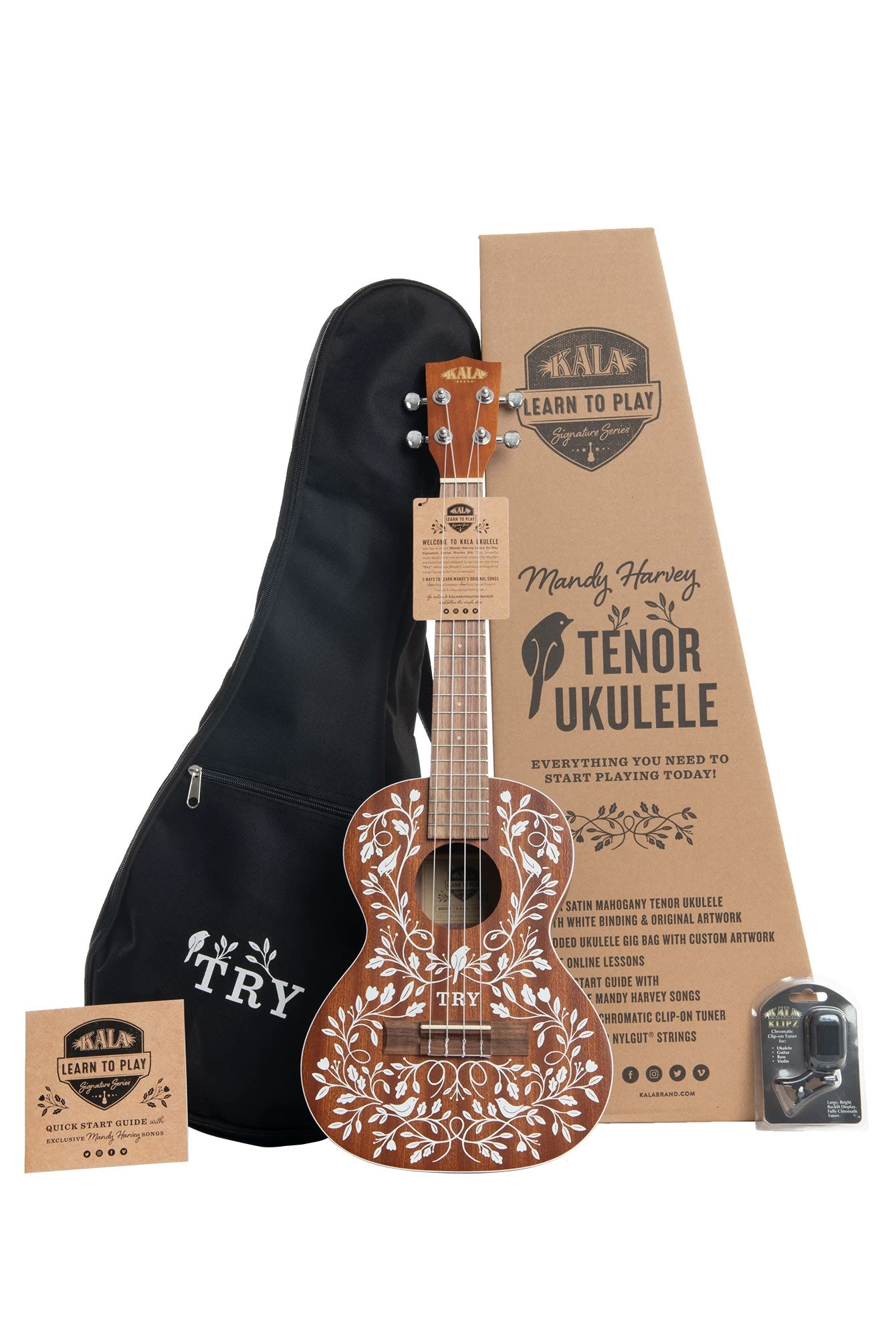 The Mandy Harvey Learn To Play Signature Series Tenor Ukulele is made of Satin Mahogany and includes white binding and original artwork reminiscent of 1800s Swiss folk art. The delicate vine pattern with birds and flowers was created by Mandyās sister, making this a very personal, one-of-a-kind piece of art.